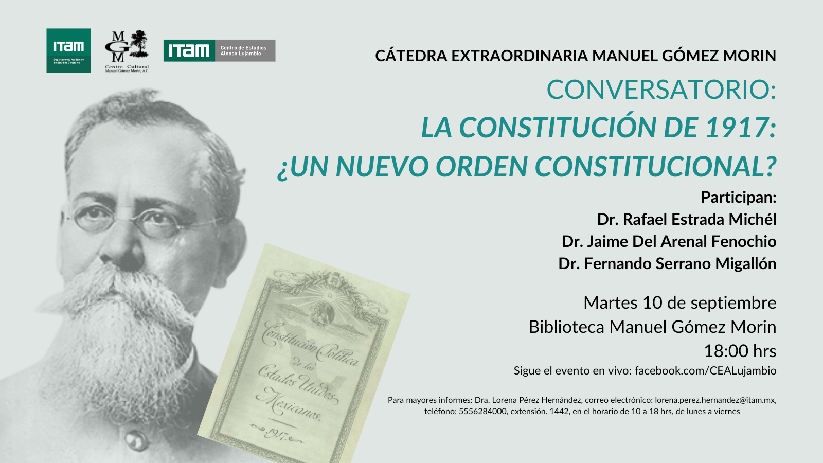 Te invitamos al conversatorio "La Constitución de 1917: ¿un nuevo orden constitucional?". Este evento forma parte de la Cátedra Extraordinaria Manuel Gómez Morin y se llevará a cabo el martes 10 de septiembre a las 18:00 hrs.